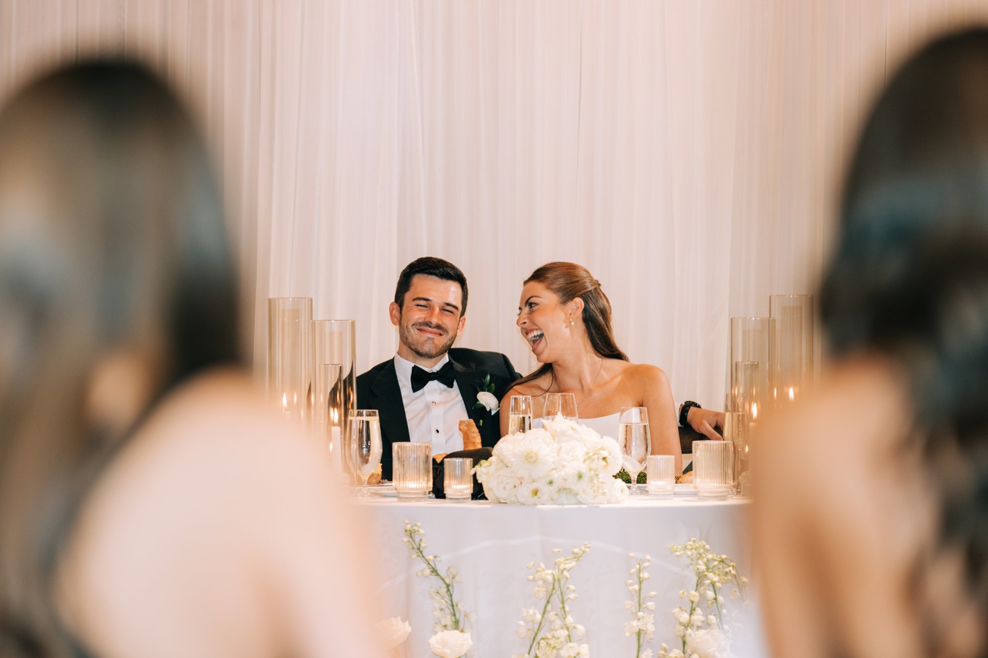 At the sweetheart table, we repurposed the ceremony arrangements on the ground to create a lush focal point, complemented by a collection of votives and taper candles on the tabletop. Even the bar received a touch of floral charm with a single bud vase and votive, tying the entire space together with effortless sophistication.
