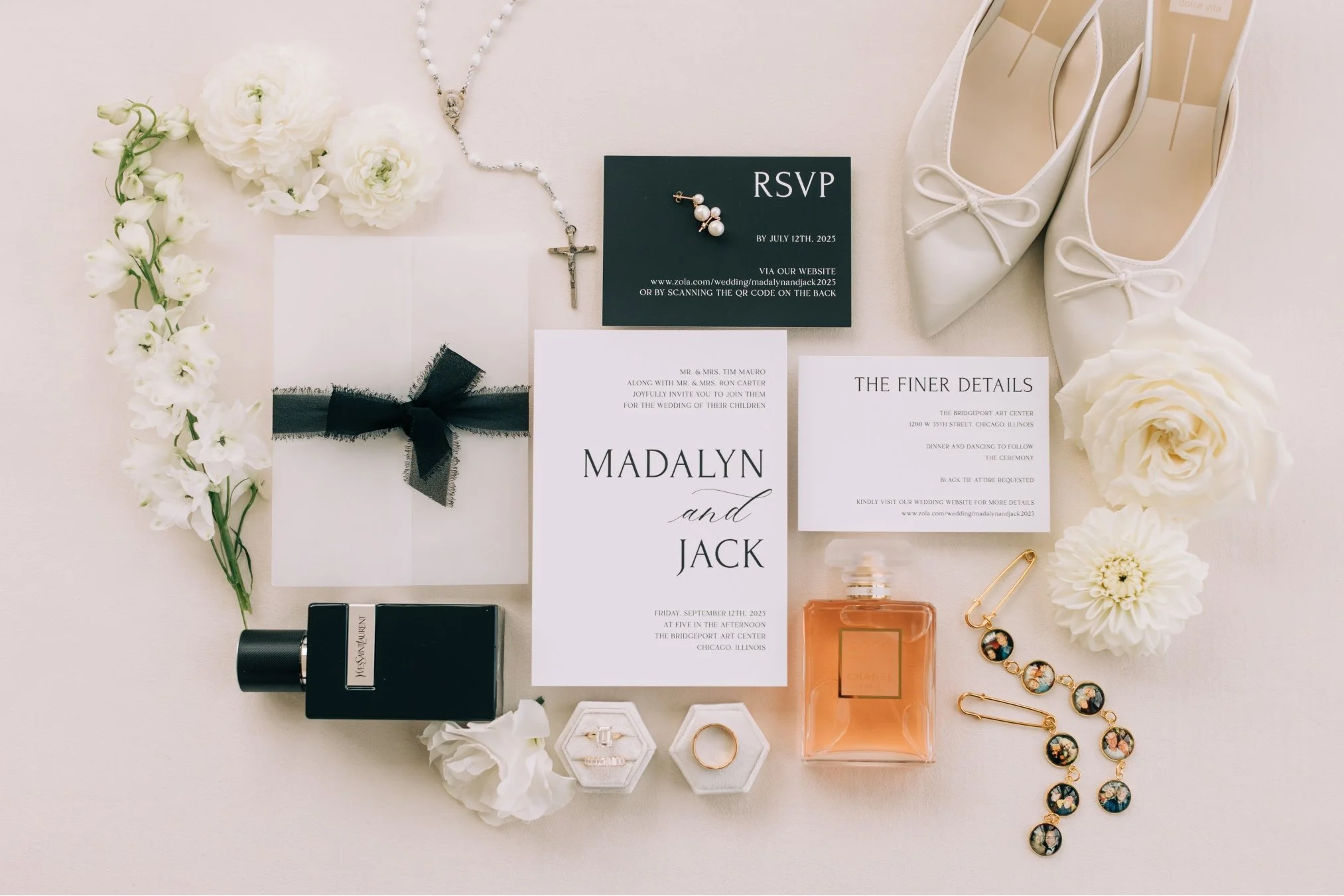 For their personal flowers, we kept everything soft, romantic, and understated to complement the classic palette. Madalyn carried a loose, natural bouquet filled with seasonal favorites- ranunculus, garden roses, and spray roses- pulled together with an ivory satin ribbon for a timeless touch. Her bridesmaids held smaller versions of her bouquet, the white-and-cream blooms popping beautifully against their black dresses. Jack wore a clean white ranunculus boutonniere with a hint of greenery, wrapped in black raw silk with exposed stems for a refined, modern finish.
