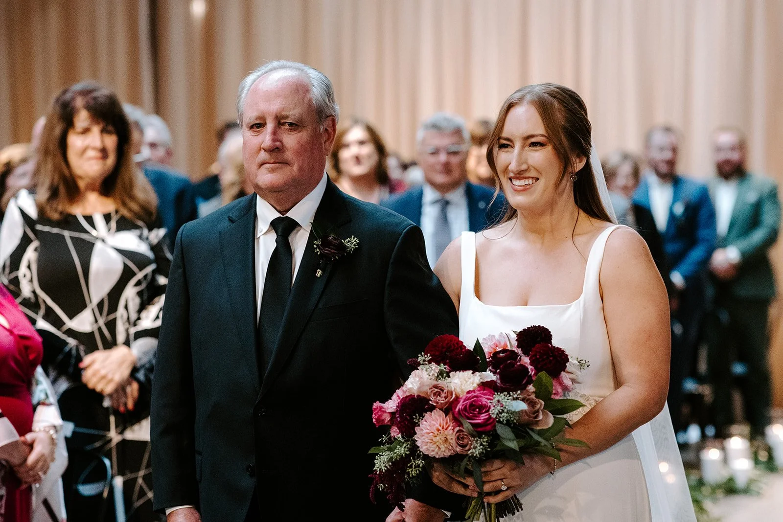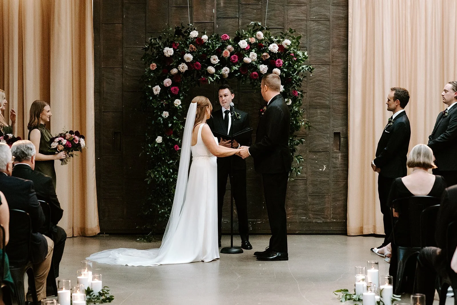 Ovation's ceremony space was transformed with lush, organic details that set a romantic stage for Kate and Tom's vows. The altar featured a dramatic drape of hanging smilax cascading all the way to the floor on one side - that asymmetrical look felt modern yet completely natural, with blooms of deep purple and burgundy nestled throughout. Pillar candles clustered with greenery lined the aisle, giving the processional a warm, moody, candlelit glow. And of course, the flower girls carried their own sweet petite bouquets.