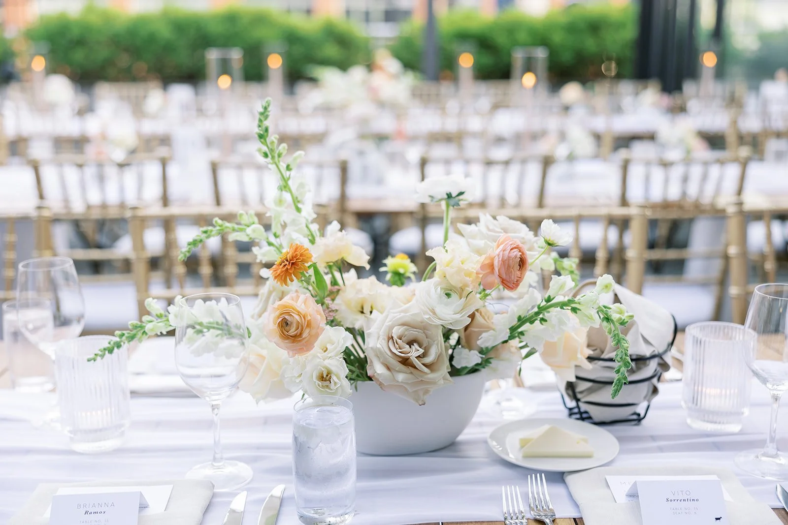 We also created two statement pieces for the aisle entrance, placed on white pedestals. We finished the ceremony look by placing a white aisle runner on the ground. The gold chiavari chairs completed the romantic ceremony decor.