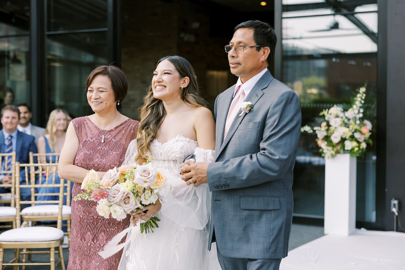 Rochelle and Eric hosted their entire celebration at Morgan’s on Fulton, an awesome venue located in Chicago’s West Loop. It was the perfect day to have a rooftop wedding! For their wedding ceremony decor, we created a romantic, curved floral backdrop that grew from the ground up.
